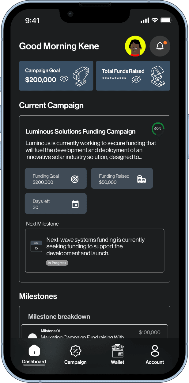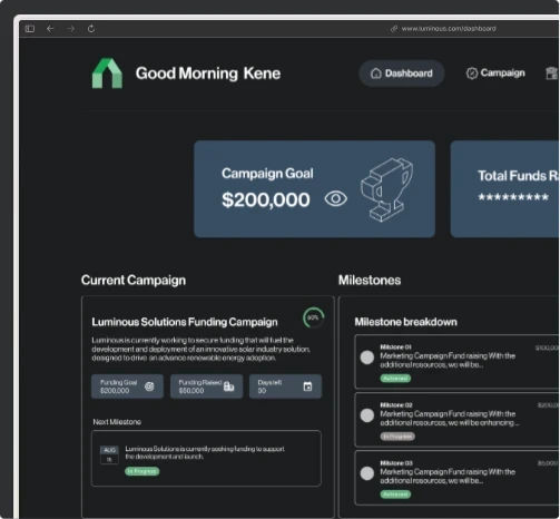 Turn your funding goals into investor-ready campaigns.Startups can easily create detailed campaigns outlining their funding targets, use-of-funds breakdown, key milestones, and traction to date.Clarity builds confidence. Let your milestones prove your momentum.